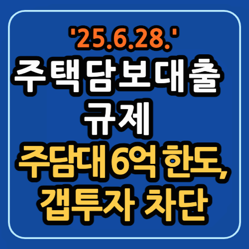 '25.6.28. '가계 대출 총량 규제'를 한 번 더 시행하겠다는 발표를 했습니다. 핵심내용은 수도권 및 규제지역의 주택담보대출 규제로 주담대 대출 6억 한도 제한 등으로 매우 강한 규제에 속합니다.